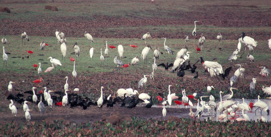 | The llanos of Venezuela can host an amazing number of herons, egrets, and storks at most times of the year. This concentration of birds was at a water hole on Hato El Cedral, Apure, in April 1992. Visible in the photo are Wood Stork, Maguari Stork, Jabiru, Scarlet Ibis, Roseate Spoonbill, Great Egret, White-necked Heron, Neotropic Cormorant, and perhaps others. Several Capyberas, a pig-sized mammal of the rodent family, are visible in the foreground and the left background. | ![]() |