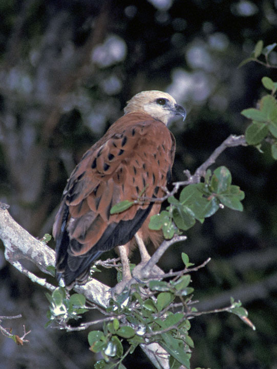 | The Black-collared Hawk (Busarellus nigricollis) ranges from southern Mexico into Brazil. It prefers wet lowlands and often perches along swamps, rivers or lakes. The adult in the two shots at right is keeping an eye on the photographer as we drifted by in a small boat. The immature bird in the 3rd image was photographed nearby. The photos were taken in April, 1992, at Hato El Cedral, Apure, Venezuela. The camera gear was a Canon T-90 & FD 400mm F4.5 lens and Fresnel flash on a BushHawk shoulder mount with Kodachrome 64. | ![]() |