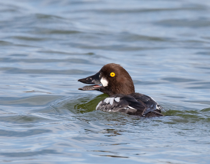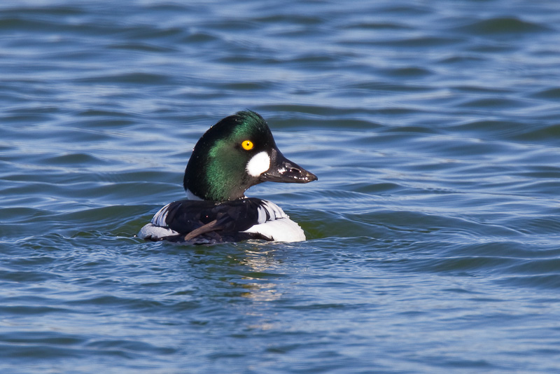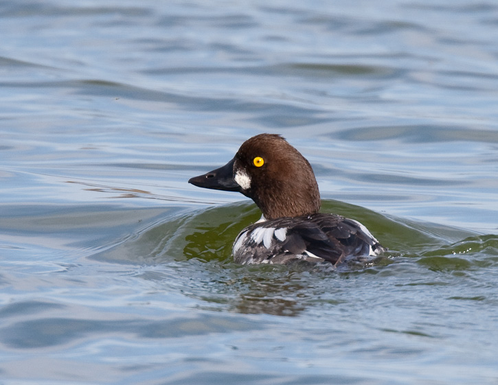 | The Common Goldeneye (Bucephala clangula) is a diving duck which nests across much of Canada and Alaska while wintering across most of the United States on both fresh and salt water. The first two images on this page show an immature male Common Goldeneye which had spent the winter in Austin, Travis Co., Texas. These two shots were taken with a Canon EOS 1D Mark III and EF 800mm F/5.6 L IS lens and 1.4X extender in March, 2009. |  |