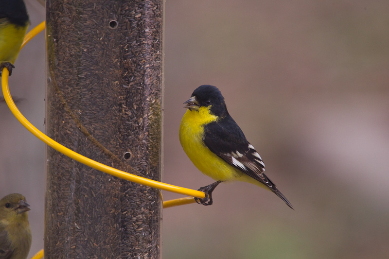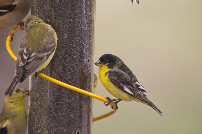 | The next two images show male Lesser Goldfinches at a thistle feeder in Dripping Springs, Hays Co., Texas, in February, 2012. | ![]() |