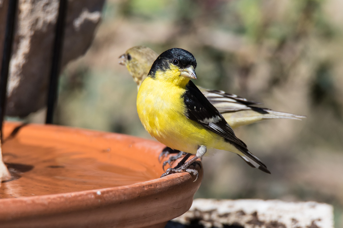 | Lesser Goldfinch Spinus psaltria male - left female - right Charro Ranch Park, Dripping Springs, Hays Co., Texas 8 February 2014 |