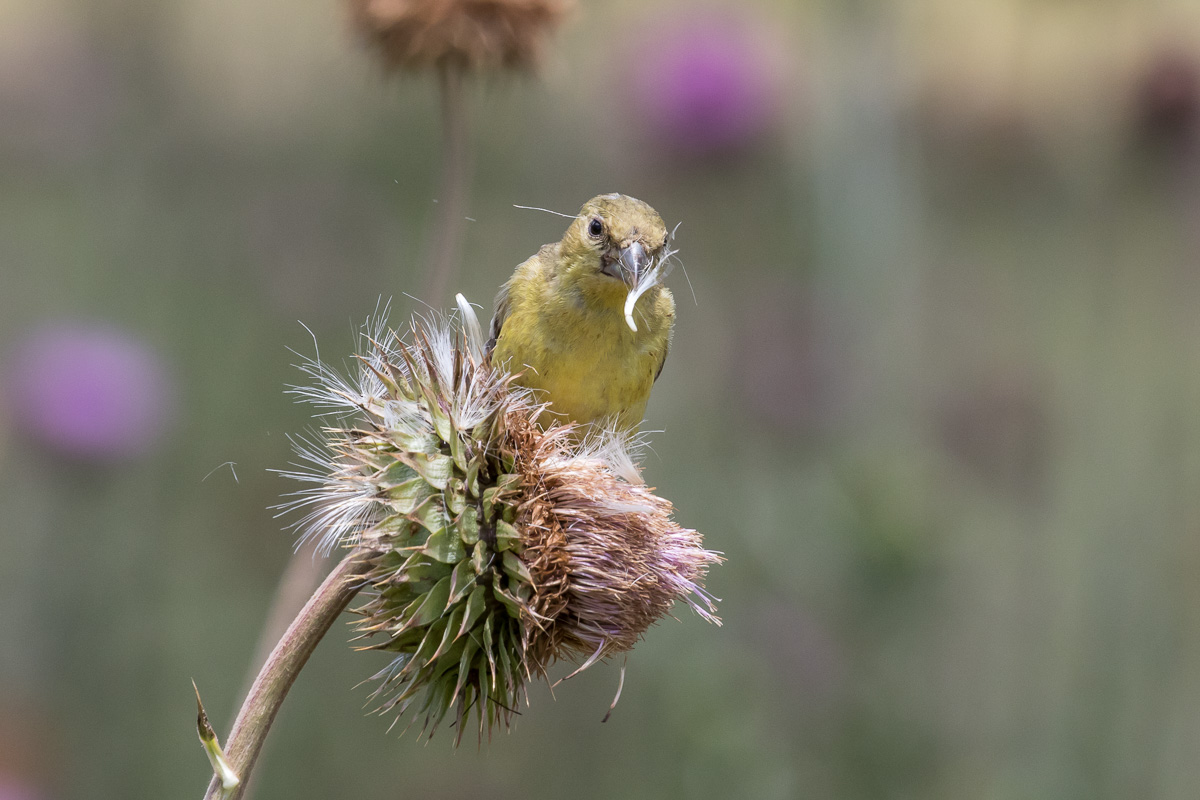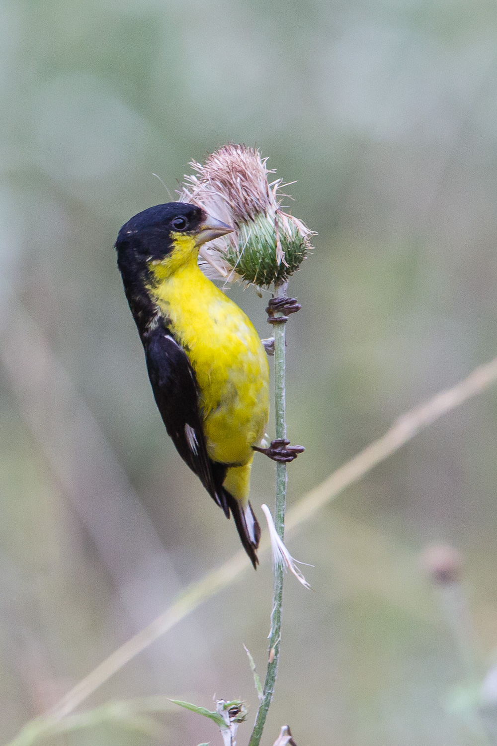 | Lesser Goldfinch Spinus psaltria female at thistle plant Dripping Springs, Hays Co., Texas 4 May 2017 |