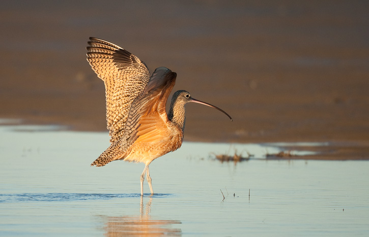 | The Long-billed Curlew shown here was photographed in the soft, golden light at dawn on a clear November, 2009, morning at Bolivar Flats, Galveston Co., Texas, with a Canon EOS 1D Mark III and an EF 800mm F/5.6 L IS lens. The next 4 shots after this one were also shot at this same date and location. | ![]() |