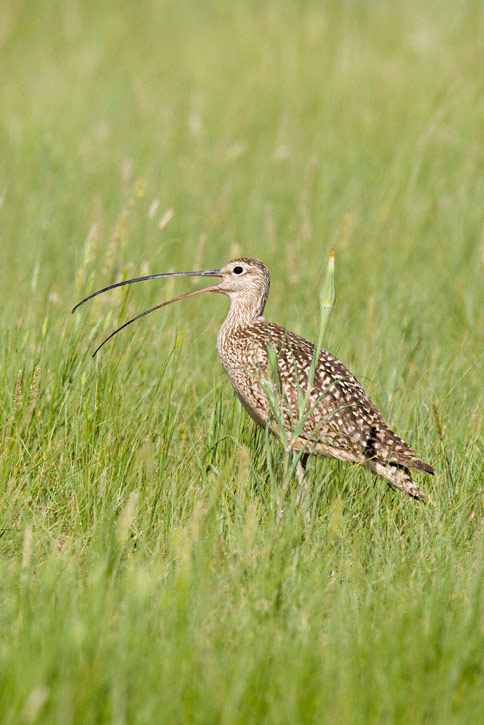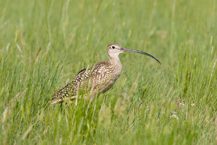 | The Long-billed Curlew (Numenius americanus) is a nesting bird of the grassland prairies of much of the central and north central United States and southern Canada. The species winters on all of our coastlines as well as the coasts of Mexico and southward. The first 9 shots on this page show Long-billed Curlews in their breeding habitat at Benton Lake N.W.R., Cascade Co., Montana, in June, 2007. These images were taken with a Canon EOS 1D Mark III and an EF 600mm F/4 L IS lens, sometimes with a 1.4X extender. | ![]() |
