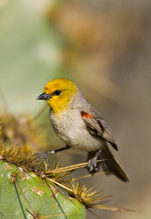 | The Verdin here is perched on the spines of a Prickly Pear, illustrating how tiny this bird is. | ![]() |