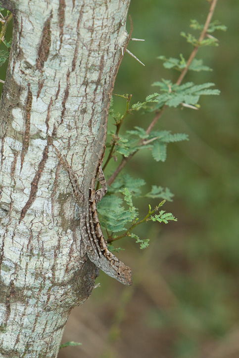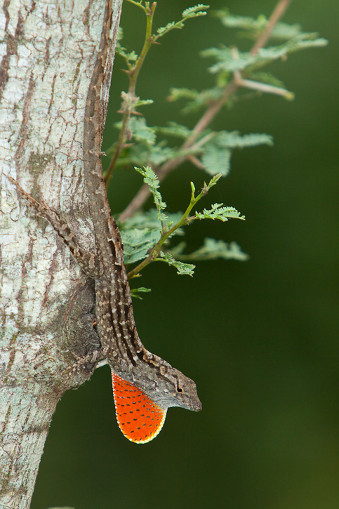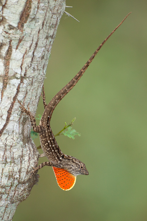 | The Brown Anole (Anolis sagrei) is also sometimes called the Bahamian Anole or Cuban Brown Anole. It is a native lizard to Cuba and the Bahamas, but it has been introduced into the southeastern United States and may be found commonly in parts of Florida and elsewhere. It is now being found even in Texas. There is evidence that this highly invasive species is having negative effects on the native Green Anole (Anolis carolinensis). The first 4 shots on this page, of a displaying male, were taken on South Padre Island, Cameron Co., Texas, in April, 2009, with a Canon EOS 50D and an EF 70-200mm F/2.8 L IS lens and 2X extender and 580 flash. | ![]() |
