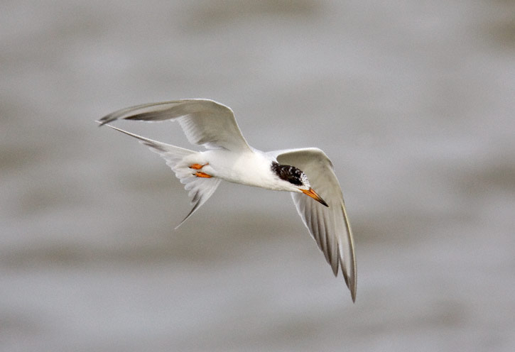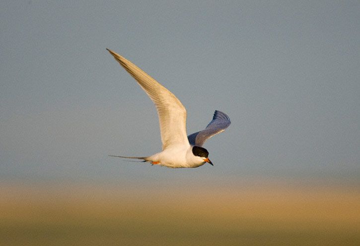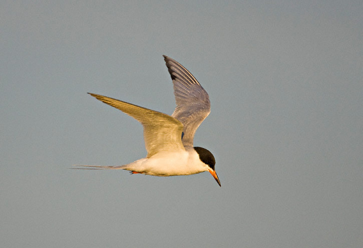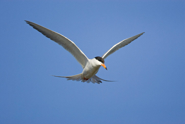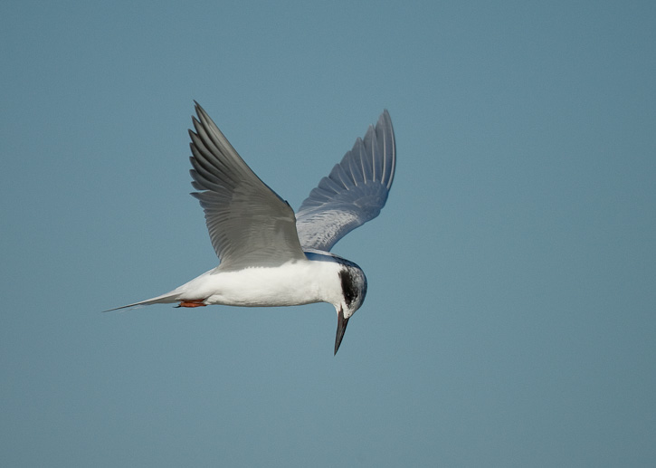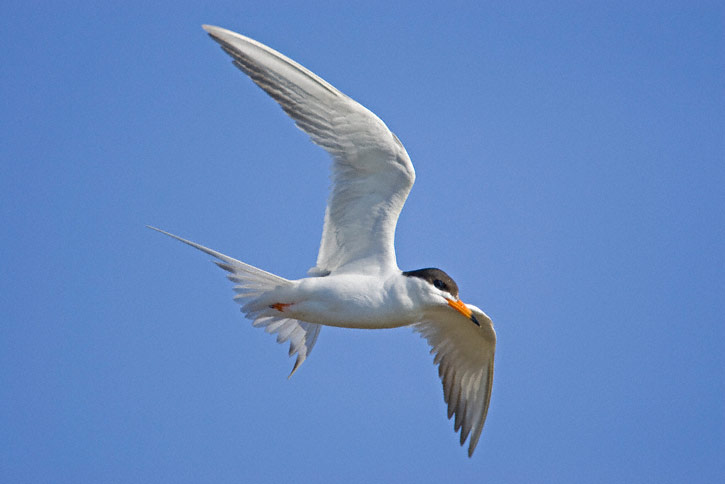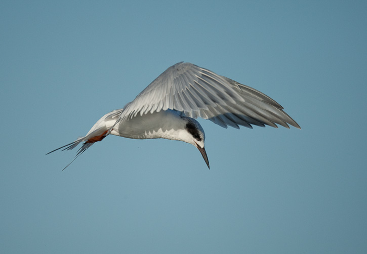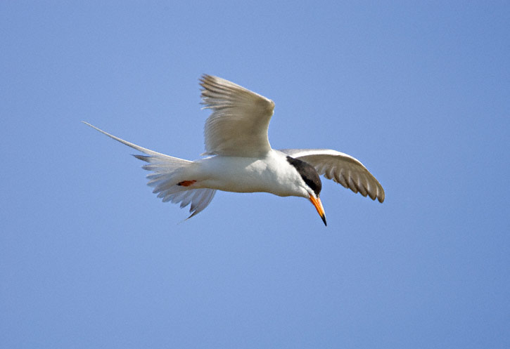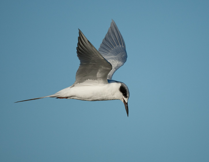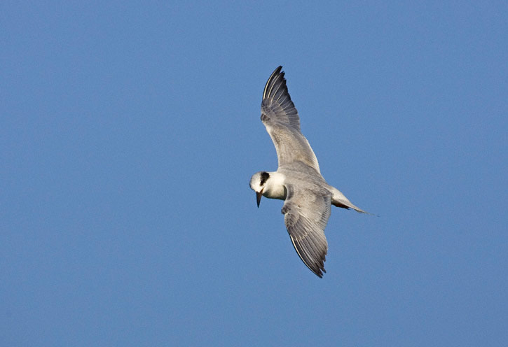 | Another Forster's Tern, staring downward. In this shot of a hovering tern, only the tip of the bird's bill can be seen under the flapping wing. |