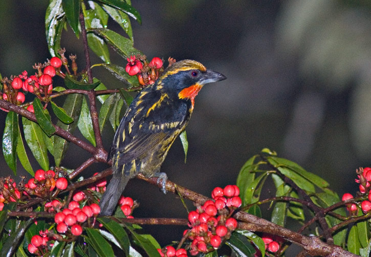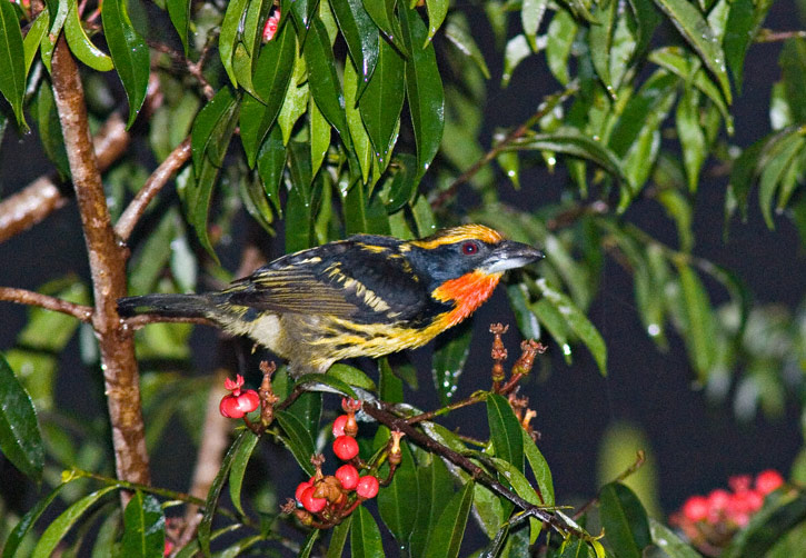 | The Gilded Barbet (Capito auratus) occurs in the forests of South America, mainly east of the Andes, from Venezuela and Columbia to areas of Brazil and Bolivia. The individual here was investigating some flower blooms at the Amazon Conservatory for Tropical Studies (ACTS), near the Rio Napo, Departmento de Loreto, Peru, in July, 2006. The images were taken with a Canon EOS 1D Mark II and EF 500 mm F/4 L IS lens and 1.4X extender. | ![]() |