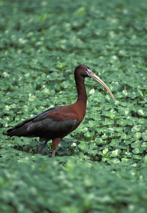 | The Glossy Ibis (Plegadis falcinellus) is a world-wide species which is locally distributed in many areas. It occurs in the extreme eastern United States with a few wandering west to Texas in some seasons. There have been a number of papers written in recent years about separating the species from the similar White-faced Ibis (P. chihi) since in all but high breeding plumage they can be difficult to tell apart. The reader is referred to many such published accounts if interested. The breeding plumaged adult Glossy Ibis shown here was at Anahuac N.W.R., Chambers Co., Texas, in April, 1996, and was photographed with a Canon T-90 and Sigma 500mm F/4.5 lens and 1.4X extender on Fuji Sensia. The immature Glossy Ibises in the next shot were photographed in March, 1997, at the Kennedy Space Center, Brevard Co., Florida, with a canon T-90 and FD 400mm F/5.6 lens on Fuji Sensia. | ![]() |