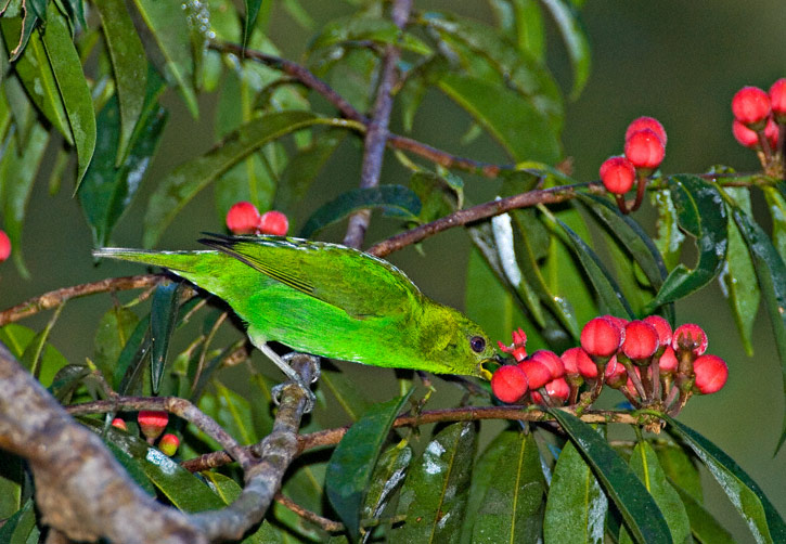 | The Green Honeycreeper (Chlorophanes spiza) occurs across a wide range from southern Mexico to southeastern South America. This species probes into flowers for nectar but also eats small fruits. The shots here were taken about 80 feet above the forest floor along a canopy walkway at the Amazon Conservatory for Tropical Studies (ACTS), near the Rio Napo, Departmento de Loreto, Peru, in July, 2006. The images were taken with a Canon EOS 1D Mark II and EF 500 mm F/4 L IS lens and 1.4X extender. The first two shots at right are of a male while the other shots show females. | ![]() |