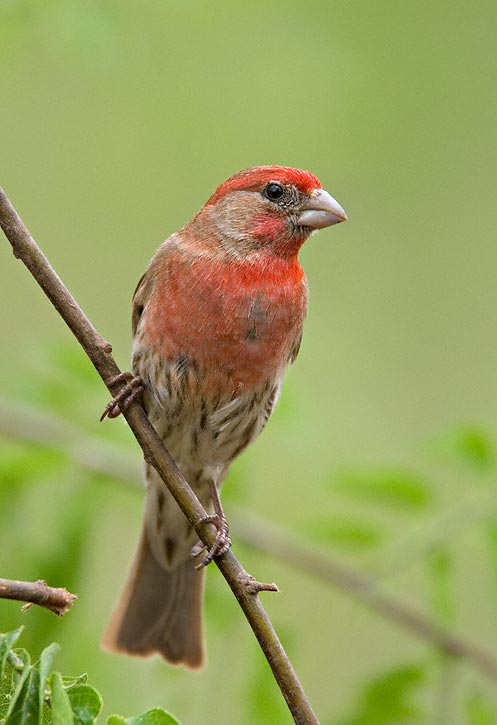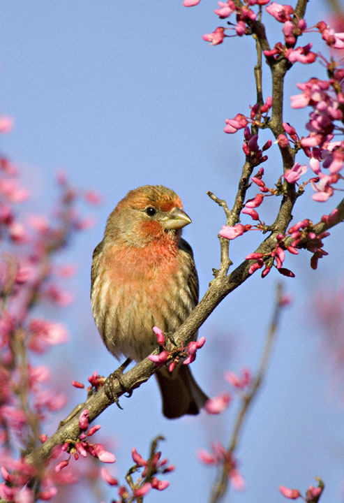 | The House Finch (Carpodacus mexicanus) is a resident bird virtually all over the United States and northern Mexico. It can be common at bird feeders and is one of the very familiar birds in suburban gardens in many areas. The first two shots here, of male birds, were taken in March, 2005, near Austin, Travis Co., Texas. The birds were visiting a bird feeder near a blooming Texas Red Bud which offered some colorful perches. The shots were taken with a Canon EOS 1D Mark II and EF 600mm F/4 L IS lens and 2X extender. | ![]() |
