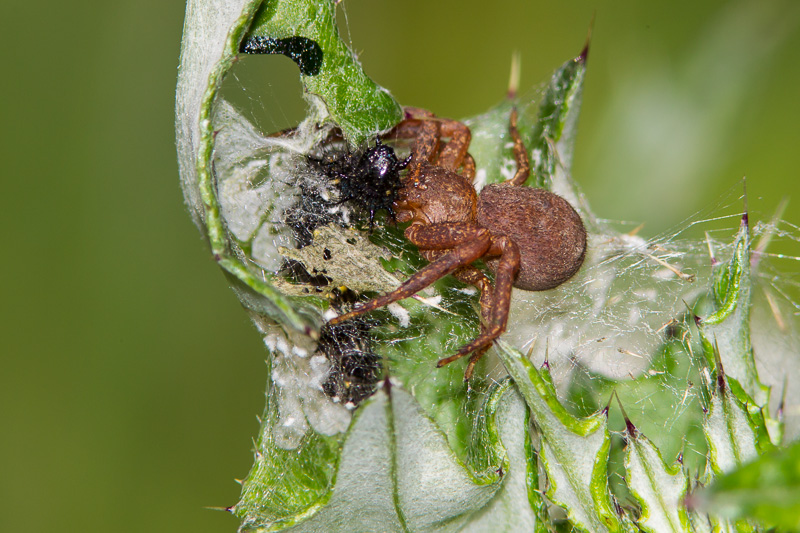 I do not think this Crab Spider (Family Thomisidae) can be identified to species level from these images, but the shots show it with a prey item. Crab Spider |