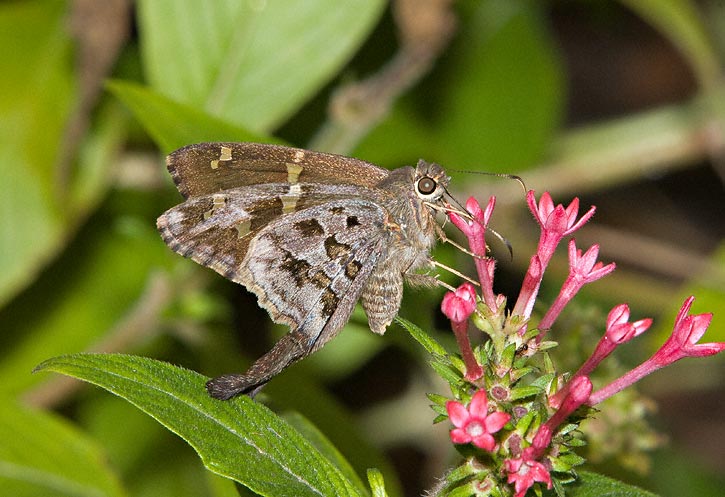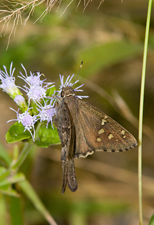 | The Dorantes Longtail (Urbanus dorantes) is a widespread South American and Central American skipper which ranges north to parts of Texas and Florida. The first 3 shots shown here were taken near Pearsall, Frio Co., Texas, in November, 2007, with a Canon EOS 1D Mark III and EF 300mm F/4 L IS lens and 2X extender. | ![]() |