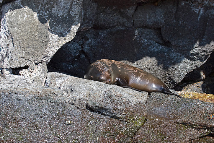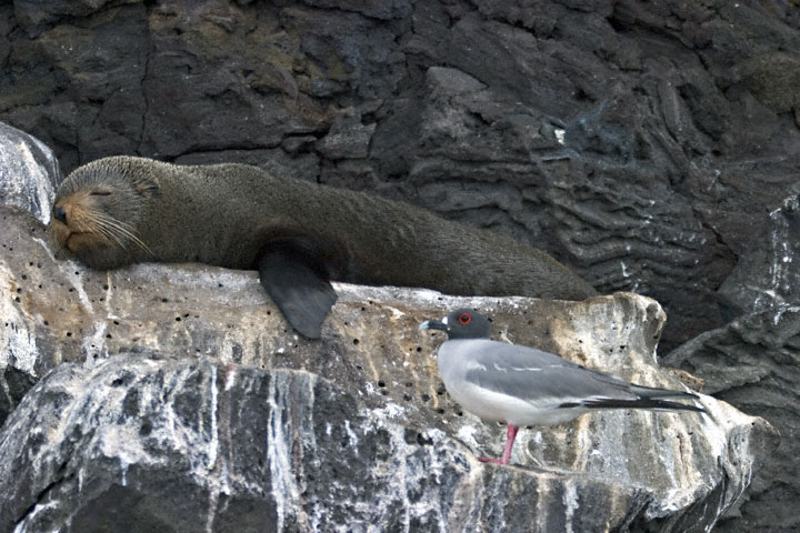 | The Galapagos Fur Seal (Arctocephalus galapagoensis) is endemic to the Galapagos Islands. The first two shots of a sleeping animal shown here were taken at Darwin Bay, Genovesa Island (also known as Tower Island) on the Galapagos Islands in July, 2003. The seal is sleeping while a Swallow-tailed Gull keeps watch. The 3rd shot was at James Bay of another sleeping fur seal. Following these initial 4 shots will be more images from another visit, in July, 2007. | ![]()  |