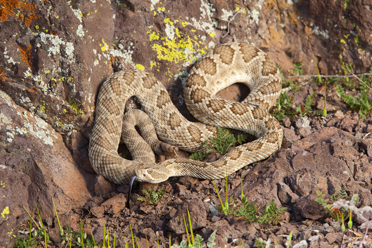 | The Mojave Rattlesnake (Crotalus scutulatus) is a venomous snake of the American Southwest and Mexico. The snake in the top 7 images on this page was found in Graham Co., Arizona. These 7 images were taken with a Canon EOS 1D Mark III and EF 70-200mm F/2.8 L IS lens in March, 2009. It was a cloudy day and we used a gold reflector to cast a warmer light on some of the images while other images were taken with natural light. It will be evident which images were taken with the gold reflector. This particular individual is unusual in that it lacks the more distinctly black and white banded tail which is usually evident on this species. This species is dangerously venomous and is generally thought to be one of the most poisonous snakes in the United States, so extreme caution is always necessary when around this animal. | ![]() |