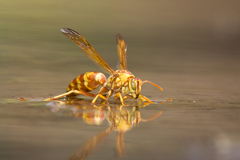 | The Paper Wasp (Polistes species) is a widespread insect across the United States. All Polistes wasps are predatory and they may consume large numbers of insect pests so they should be considered beneficial. They can be aggressive if their nest is threatened, but for the most part they will leave you alone of you leave them alone. There are many species in this genus and most cannot be identified easily from photos, so the ones on this page have just been labeled as Paper Wasp species. The first two shots on this page show a paper wasp resting on water while it drinks. It's light weight and waxy body allow it to float on water in this manner. These two shots were taken in May, 2006, near McCook, Hidalgo Co., Texas, with a Canon EOS 1D Mark II and an EF 300mm F/4 L IS lens and 2X extender. |