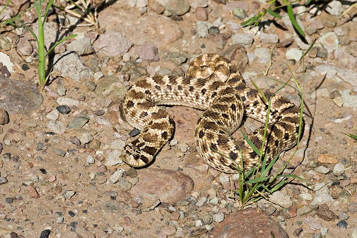 | The Western Hognose Snake (Heterodon nasicus) is a harmless colubrid snake found in much of the western United States as well as parts of western Canada and northern Mexico. The species is considered to be a mildly venomous, rear-fanged species but it poses no threat to man. The venom is used to secure its prey and the species has not been known to bite a human. The first two shots here were taken in Presidio Co., Texas, in September, 2006, with a Canon EOS 1D Mark II and EF 300mm F/4 L IS lens. This particular subspecies is sometimes called Mexican Hognose Snake or Kennerly's Hognose Snake (H. n. kennerlyi). | ![]() |