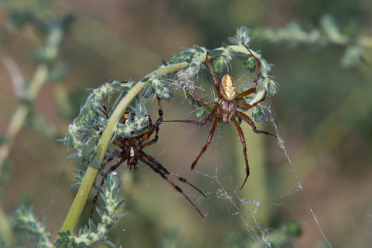 | The two Western Spotted Orbweavers (Neoscona oaxacensis) in the next two shots were at Walker Lake, Mineral Co., Nevada, in August, 2012. These shots were taken with a Canon EOS 1D Mark IV and an EF 300mm F/4 L IS lens and 1.4X extender and 580 flash. |