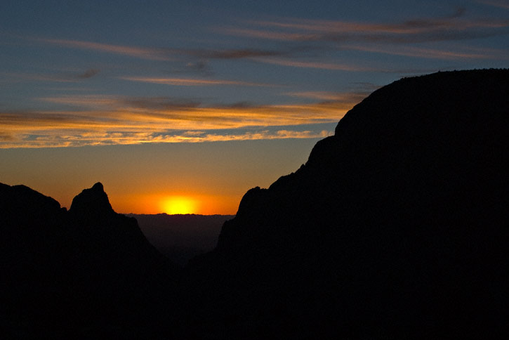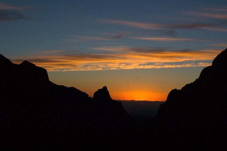 | The Window, Big Bend National Park. The two shots here were taken in May, 2003 of the sunset as viewed from the Chisos Mountain Lodge in Big Bend National Park. The low area in the distant mountain skyline is known as The Window. These were digital images with a Canon 10D and EF 17-35 mm F/2.8 lens. | ![]() |