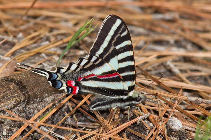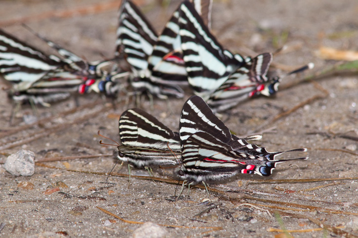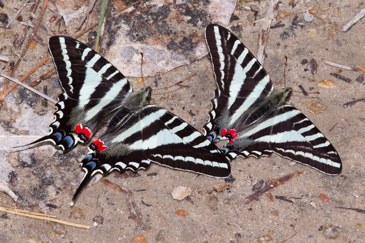 | The Zebra Swallowtail on the right was in the Kisatchie National Forest, Natchitoches Parish, Louisiana, in March, 2012. This image was taken with a Canon EOS 1D Mark IV and a Sigma 50-500mm lens and Canon 580 flash. |