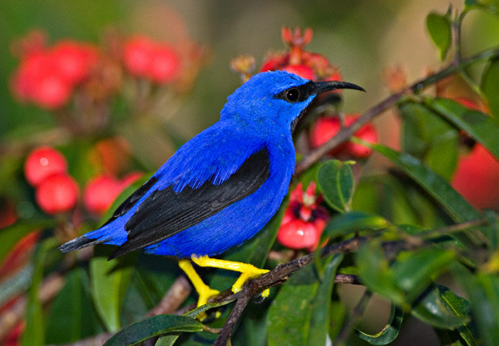 | The Purple Honeycreeper (Cyanerpes caeruleus) occurs across a wide range in the jungles and forests of the northern two thirds of South America. This species probes into flowers for nectar but also may eat small fruits. The shots here were taken about 80 feet above the forest floor along a canopy walkway at the Amazon Conservatory for Tropical Studies (ACTS), near the Rio Napo, Departmento de Loreto, Peru, in July, 2006. The images were taken with a Canon EOS 1D Mark II and EF 500 mm F/4 L IS lens and 1.4X extender. The first shot is a male while the next shot shows a female. | ![]() |