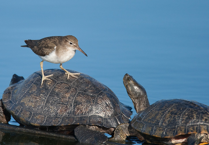 | The next 11 images of Spotted Sandpiper were all taken in Austin, Travis Co., Texas, in January, 2010, with a Canon EOS 1D Mark III and an EF 800mm F/5.6 L IS lens. The first shots show a winter plumaged Spotted Sandpiper using some pond sliders as stepping stones. | ![]() |