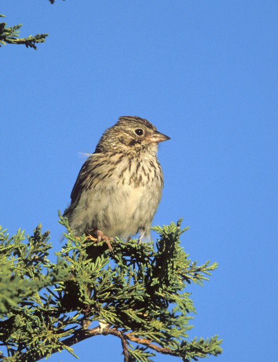 | The Vesper Sparrow (Pooecetes gramineus) breeds across most of the northern half of the United States (but it is more common in the west) and into the plains of western Canada. It uses a variety of habitats including grasslands, sagebrush, brush lands, etc. It is a common wintering species in the southern United States where it can often be found in fairly large numbers in the right habitat. The first two individuals pictured here, males on nesting territories, were photographed near Vernal, Uintah Co., Utah in June, 2001, with a Canon EOS 3 and an EF 500 mm F4L IS lens with a 2X extender on Fuji Velvia. | ![]() |