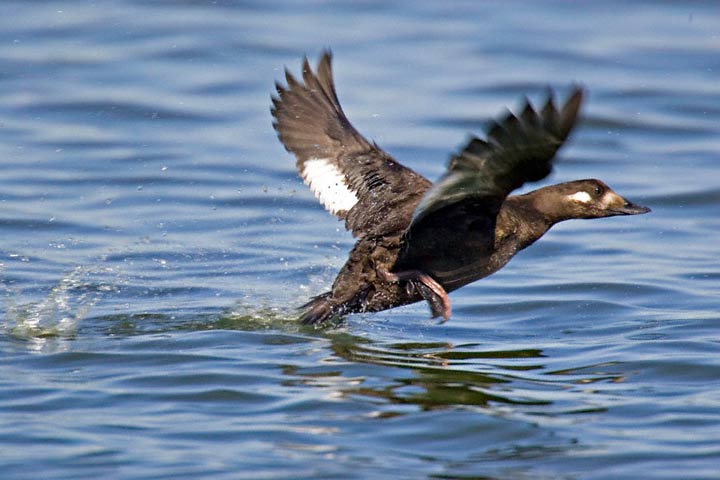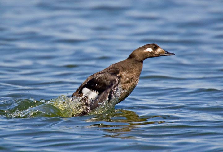 | The White-winged Scoter (Melanitta fusca) is a diving duck which breeds on fresh-water ponds and lakes in northwest Canada and Alaska. It winters mainly along the Atlantic and Pacific coasts of the United States with a few venturing along the Gulf coast. It is typically fairly rare in Texas, especially inland. The female or immature shown here was at Austin, Travis Co., Texas, in November, 2005. It was photographed with a Canon EOS 1D Mark II and EF 600mm F/4 L IS lens and 2X extender. |  |