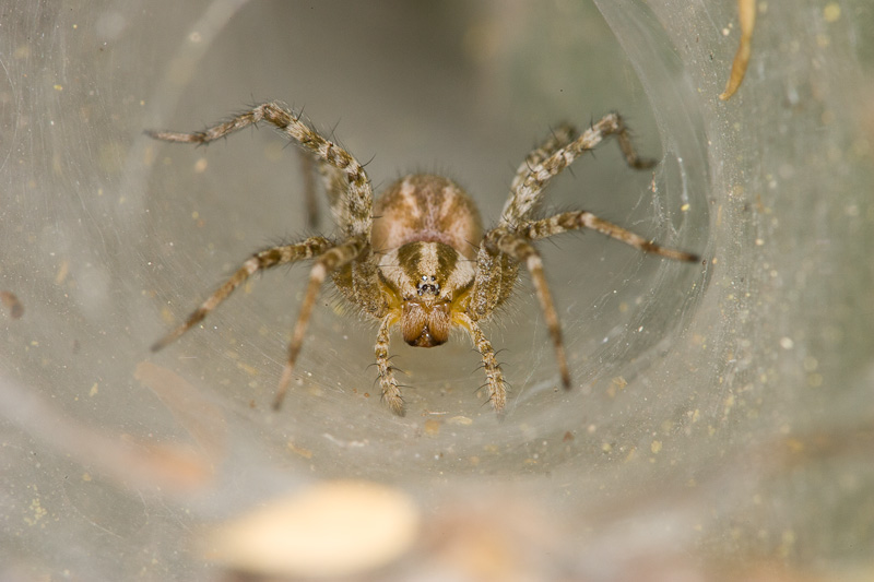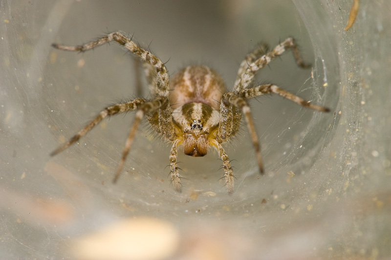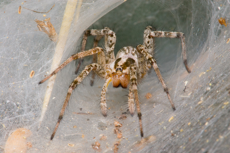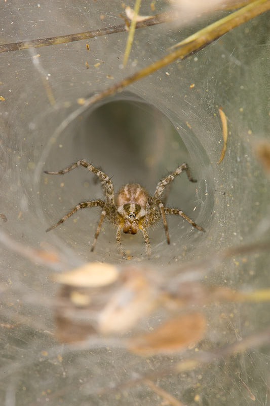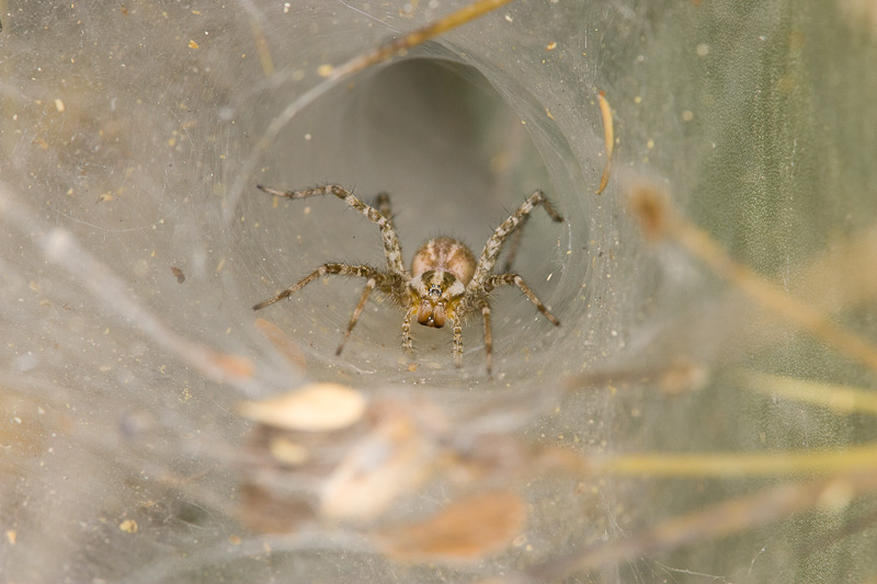 | The Funnel Weaver Spider (Agelenopsis species) is commonly encountered in areas of Prickly Pear Cactus in south Texas. The spider makes a very thick web with a tunnel that allows the spider to retreat back inside the tunnel to a dark, protected area to wait for a prey item to touch the web at which time the spider will dart out to grab the prey. The first six images on this page were taken in April, 2006, in Hidalgo Co., Texas, with a Canon EOS 1D Mark II and an EF 180 mm F/3.5 Macro lens. | ![]() |
