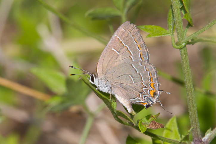 The Soapberry Hairstreak (Phaeostrymon alcestis) is a localized butterfly of parts of Texas, Kansas, Oklahoma, Arizona, and New Mexico. It is seldom found far from its larval food plant, soapberry trees but sometimes feeds on nearby blooming plants. The first 2 shots on this page were taken in May, 2008, at the Nails Creek Unit of Lake Somerville State Park, Lee Co., Texas, with a Canon EOS 1D Mark III and EF 300mm F/4 L IS lens and 2X extender and flash. |