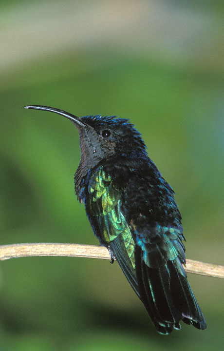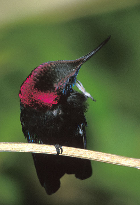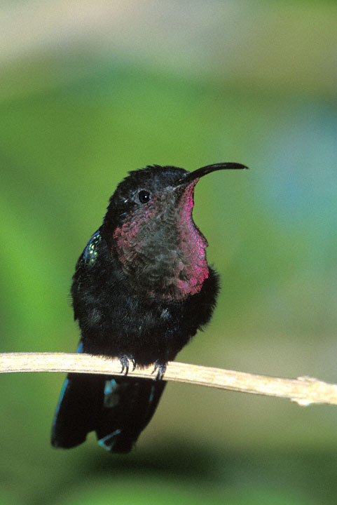 | The Purple-throated Carib (Eulampis jugularis) is an attractive resident of the Lesser Antilles. It is a large, dark hummingbird which can be somewhat difficult to photograph (at least for me!) since it often stays in the shade. The throat of this bird glows a deep purple when the light hits it just right. The four shots shown here were taken on the island of Saba in the Lesser Antilles in July, 2001, with a Canon EOS 3 and EF 500 mm F4L IS lens on Fuji Velvia. The stunning color of the throat is especially evident in the shot of the bird scratching himself. | ![]() |