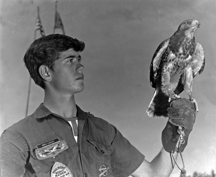 | The shot shown here was taken in July, 1968, at Philmont Scout Ranch in Cimarron, New Mexico. I worked at this scout ranch for the summers of 1967 and 1968. During the summer of '68 I had a young Swainson's Hawk and a friend had a young Prairie Falcon. We trained these birds in the sport of falconry. Was I really ever that young? The bird was released later that fall just before I went off to the U.S. Air Force. |
