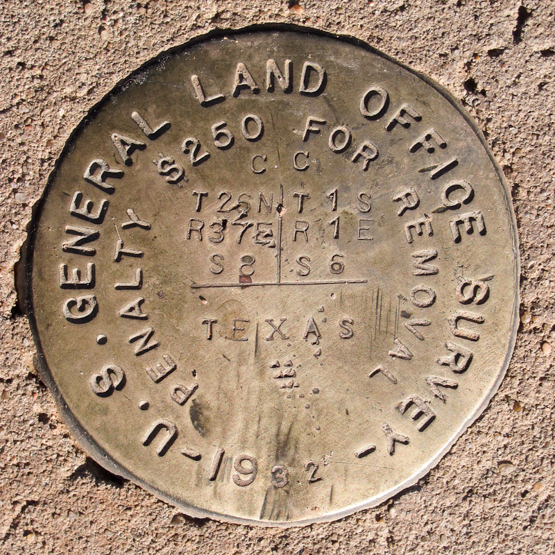 | The photo on the right shows the top of the survey marker post which is shown in the previous image. The Texas line runs east to west while the line dividing Oklahoma and New Mexico intersects the Texas line from the north. North is to the top of this image. Chuck Sexton took this shot at the same time the previous image was taken. |