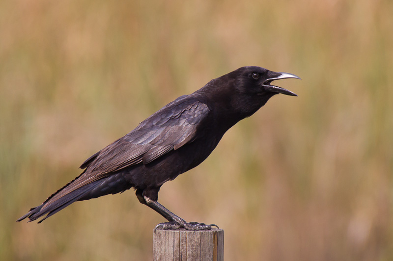 | The American Crow (Corvus brachyrhynchos) occurs across almost all of the United States and Canada. It is a common and abundant species which may be regarded as a pest by farmers. It feeds on grain, insects, carrion, or virtually anything else. It is often seen in large flocks. The first 3 images of American Crows shown here were taken at Bosque del Apache N.W.R., Socorro Co., New Mexico, in November, 2009, with a Canon EOS 1D Mark III and an EF 800mm F/5.6 L IS lens. |
