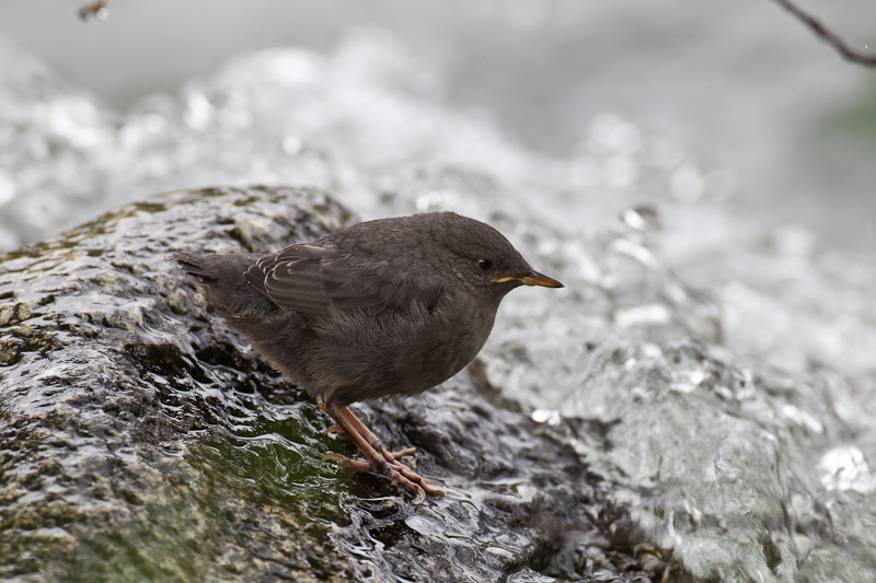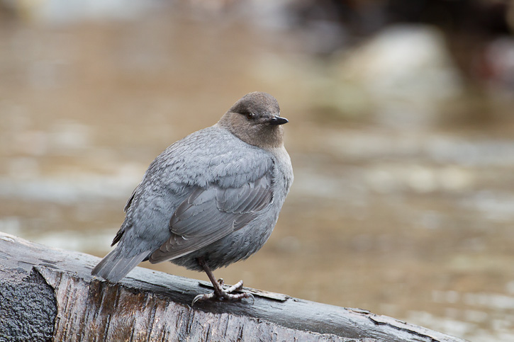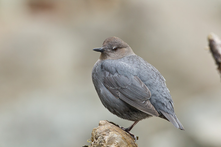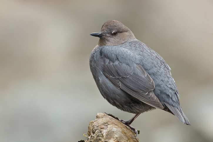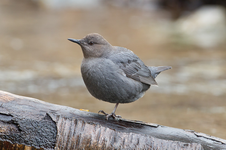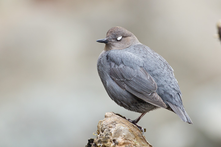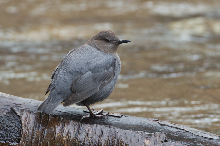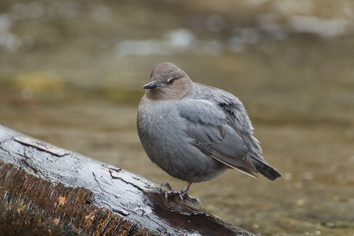 | The American Dipper (Cinclus mexicanus) occurs along mountain streams from parts of southern Mexico north through the western United States into Alaska. Dippers are unique in their ability to walk and swim underwater even in swiftly flowing streams. They have white feathers on their eye-lids which cause the eyes to seemingly blink black and white. The first nine shots on this page were taken along Campbell Creek near Anchorage, Alaska, in May, 2012 with a Canon EOS 1D Mark IV and an EF 500mm F/4 L IS lens and 1.4X extender. |