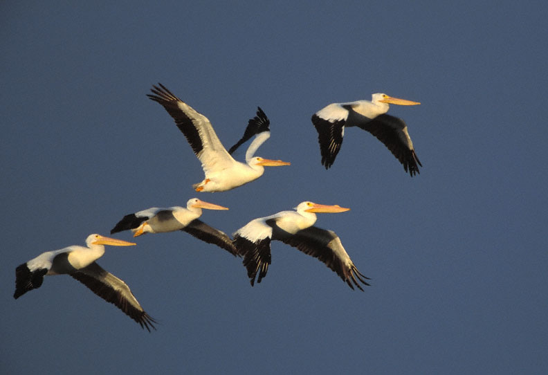 | The shot at right shows American White Pelicans in flight over Lake Tohopekaliga, Kissimmee, Osceola Co., Florida, in February 2007. The shot was taken with a Canon EOS 1D Mark II and EF 500mm F/4 L IS lens. |