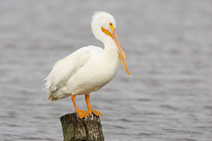 | To the right will be a series of three shots taken at the Texas City Dike, Galveston Co., Texas, in February, 2005. The shots show an American White Pelican asleep on a piling, standing alert, and then finally in a big yawn during which the bird's pouch was turned inside out! These were shot with a Canon EOS 1 Mark II and EF 600mm F/4 L IS lens and 1.4X extender. |