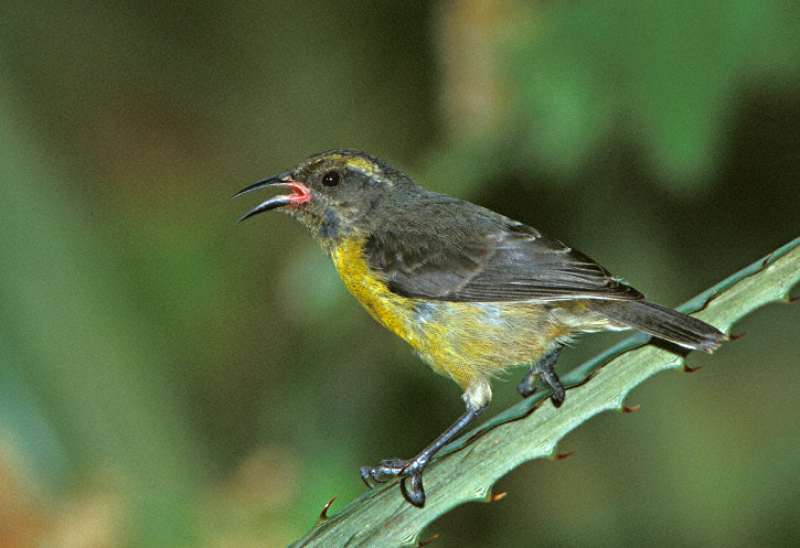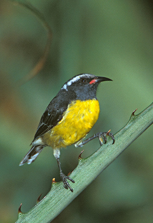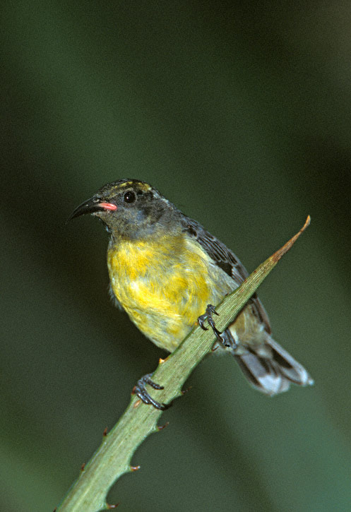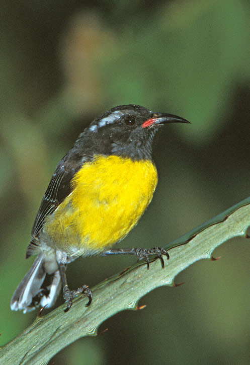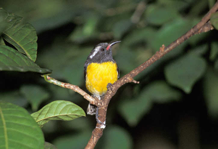 | The Bananaquit (Coereba flaveola) is a common resident of most of the Caribbean area and has even strayed to south Florida on occasion. The species varies in appearance from one area to another with individuals showing both a pale and a dark throat depending upon the area. Completely black colored Bananaquits occur on the islands of Grenada and St. Vincent. Visitors to some areas of the Caribbean may encounter these birds in large numbers hanging around outdoor restaurants where they may land at your table to seek a snack. The species can be quite tame and very easy to see. The shots shown here were taken on the island of Saba in the Lesser Antilles in July, 2001, with a Canon EOS 3 and EF 500 mm F4/L IS lens on Fuji Velvia. | ![]() |