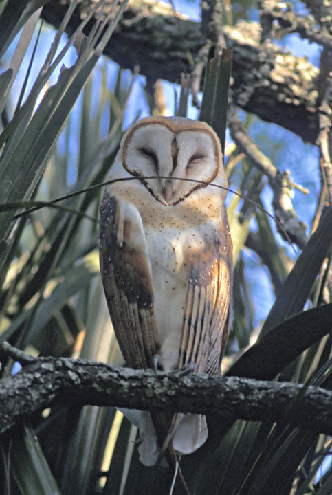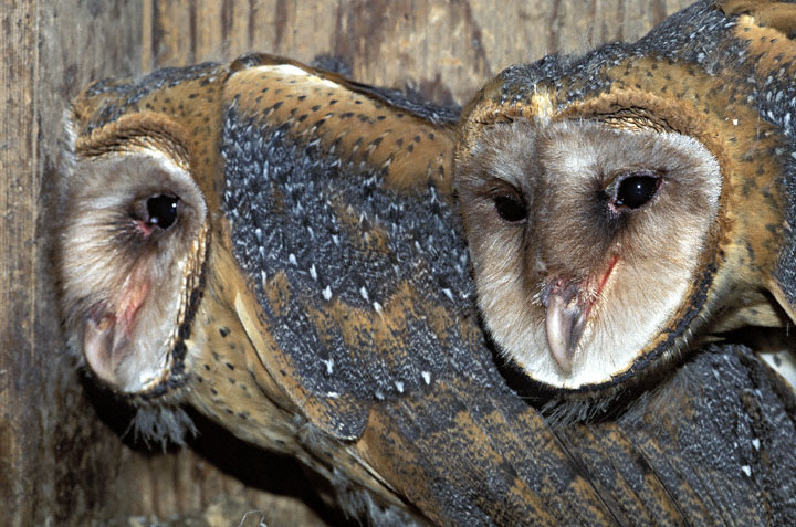 | The Barn Owl (Tyto alba) is a common and widespread species across the United States and Mexico. It often nests in old farm buildings, barns, and in Texas, deer blinds. The shot of the adult here was taken in Kenedy Co., Texas, in April, 1998, with a Canon T90 and 400mm F/5.6 lens on Kodachrome 200 film. |
