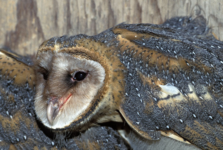 | At right is a shot of a downy nestling Barn Owl inside a deer blind in Kenedy Co., Texas in June, 2002. Following are two shots of young Barn Owls, just about old enough to fledge, taken in this same deer blind two years earlier, in June, 2000. The shots of all the young birds were taken with a Canon EOS 3 camera and an EF 70-200 mm F/2.8 L lens on Fuji Velvia. |