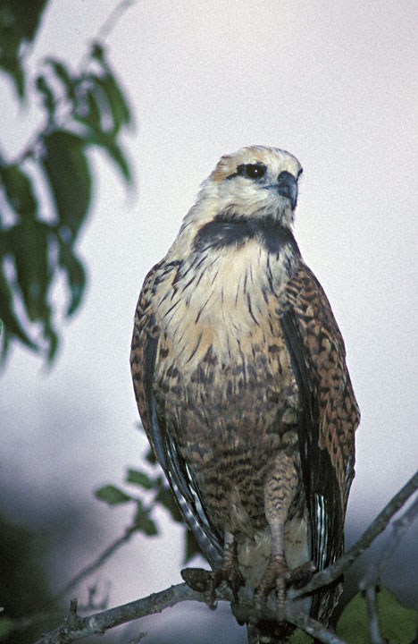 The Black-collared Hawk (Busarellus nigricollis) ranges from southern Mexico into Brazil. It prefers wet lowlands and often perches along swamps, rivers or lakes. The adult in the two shots at right is keeping an eye on the photographer as we drifted by in a small boat. The immature bird in the 3rd image was photographed nearby. The photos were taken in April, 1992, at Hato El Cedral, Apure, Venezuela. The camera gear was a Canon T-90 & FD 400mm F4.5 lens and Fresnel flash on a BushHawk shoulder mount with Kodachrome 64. | ![]() |