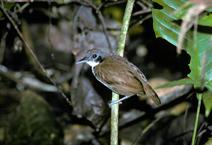 | The Bicolored Antbird (Gymnopithys leucaspis) is a resident of tropical forests from Nicaragua southward into Brazil. The species prefers the forest undergrowth, and, as the name implies, often feeds on insects which are flushed by ant swarms. This shot was taken in Cana, in the Darien of Panama, in April, 1995, with a Canon T-90 and FD 400mm F/4.5 lens and flash on Kodak Eckachrome 200 film. | ![]() |