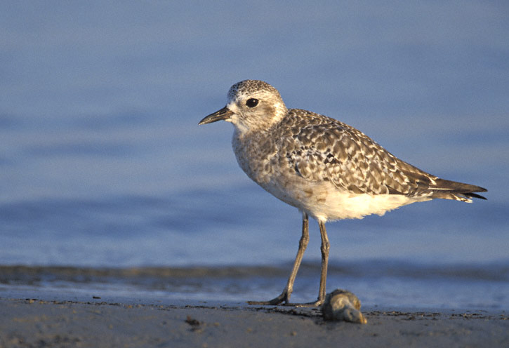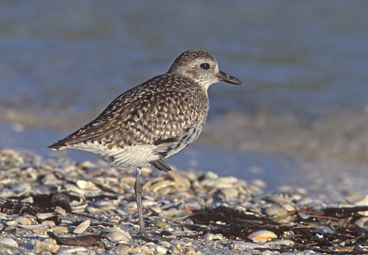| The Black-bellied Plover (Pluvialis squatarola) is a fairly common shorebird species which breeds in the arctic tundra and winters along all the coasts of the United States and Mexico southward to South America. In breeding plumage the species has entirely black underparts as well as a black face, while in winter it loses most of the black. The first shot here was a wintering bird at San Luis Pass, Galveston Co., Texas, in September, 1999. The next two shots were taken on Sanibel Island, Lee Co., Florida, in December, 2000, also of wintering birds. These three images were all taken with a Canon EOS 1N and EF 300mm F/2.8 L lens and 2X extender on Fuji Sensia film. |