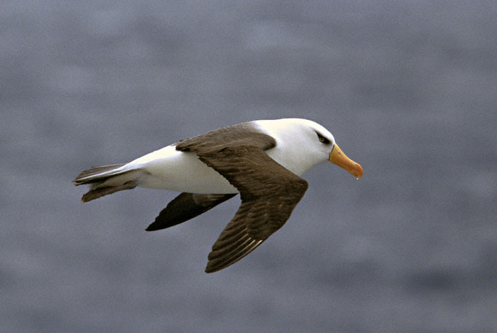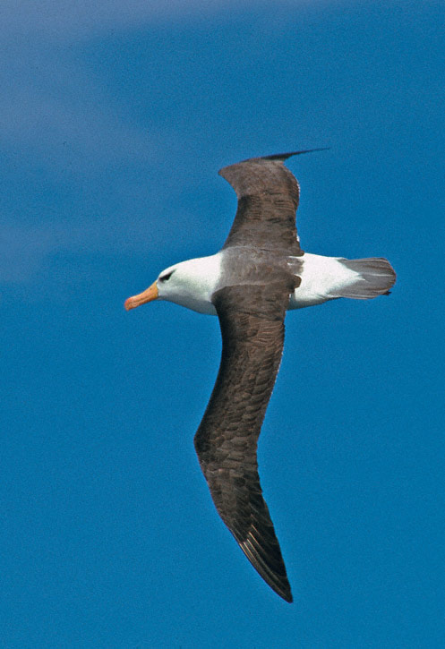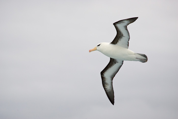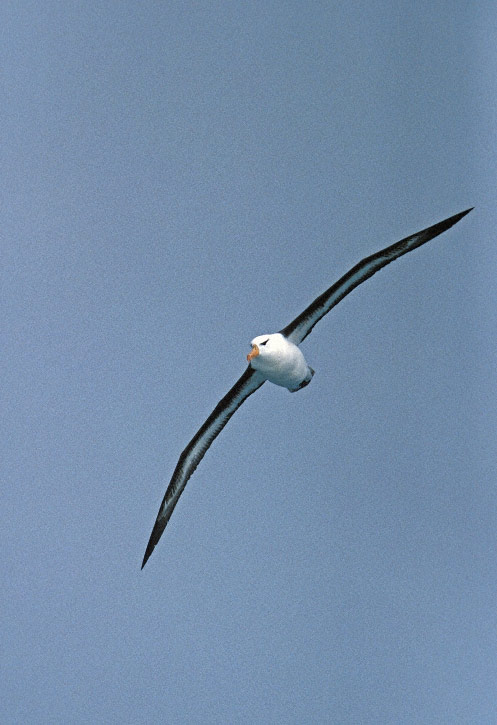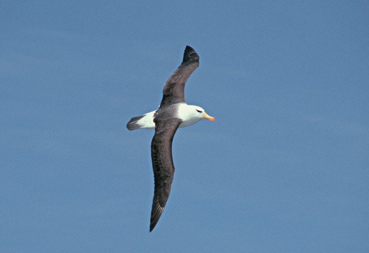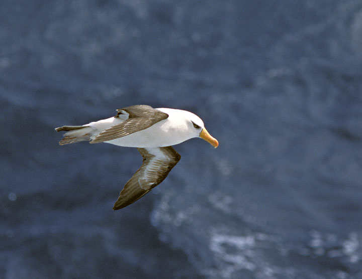 | The shot at right shows a Black-browed Albatross in flight near the Falkland Islands in January, 2005. It is a digital image taken with a Canon EOS 1D Mark II and EF 300m F/2.8 L lens and 2X extender. |