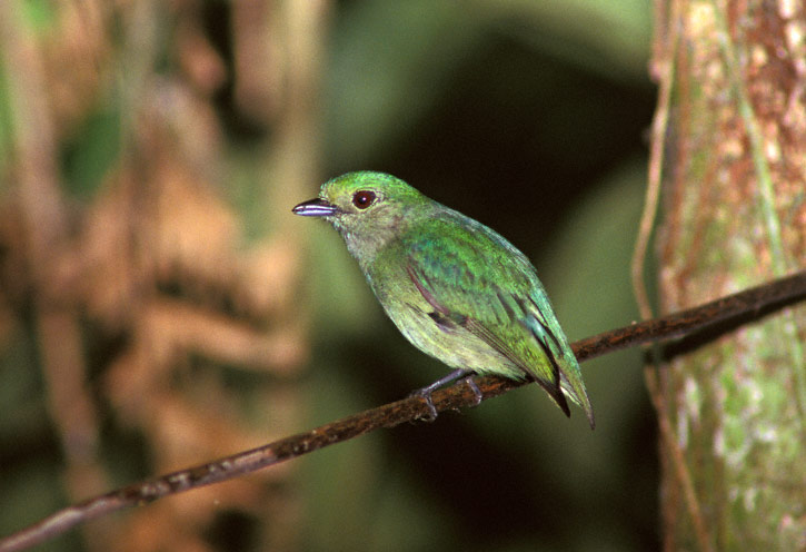 | The Blue-crowned Manakin (Pipra coronata) is a resident bird from Costa Rica south to a large area of northern South America. It inhabits tropical lowland evergreen forest. The two shots here of a female were taken at Cana, in the Darien of Panama, in March, 1995, with a Canon T-90 and FD 400mm F/4.5 lens on Fuji Sensia film. | ![]() |