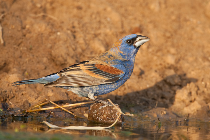 | The next 3 shots show male Blue Grosbeaks in several different stages of spring moult. These birds were coming to a water hole to drink on a hot April, 2009, afternoon, in Starr Co., Texas. These images were taken with a Canon EOS 1D Mark III and an EF 800mm F/5.6 L IS lens and 1.4X extender. |
