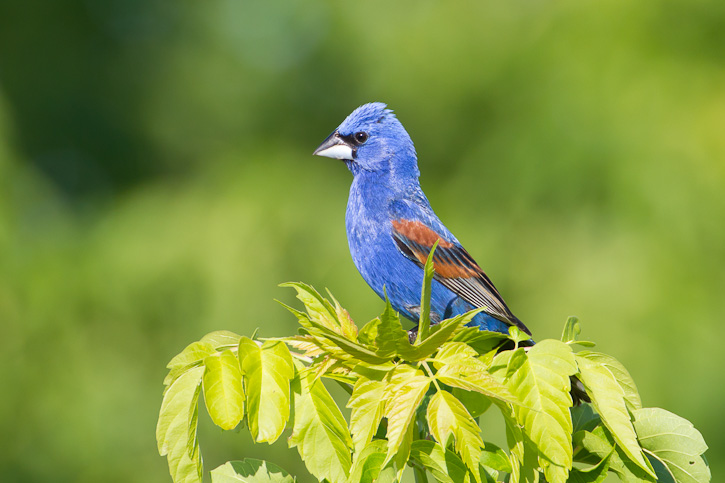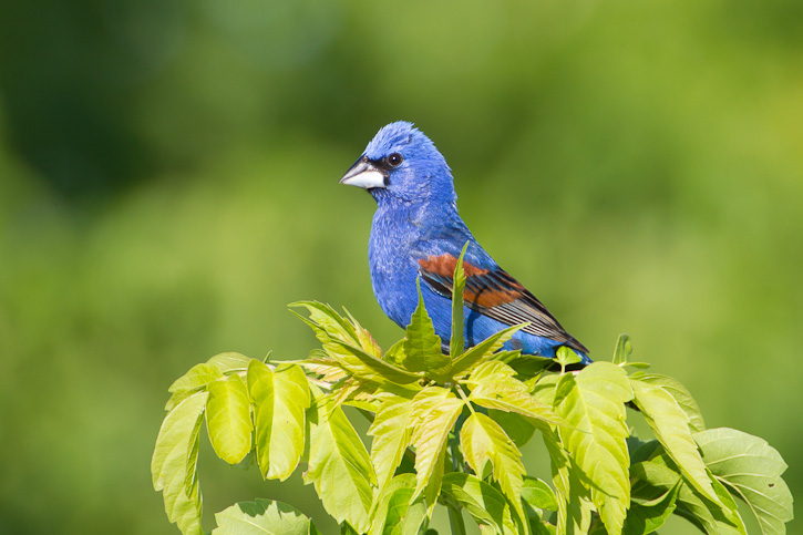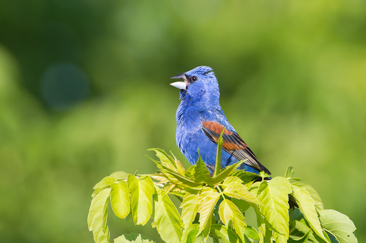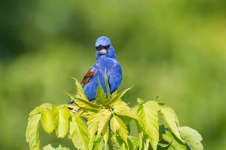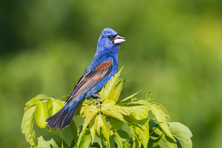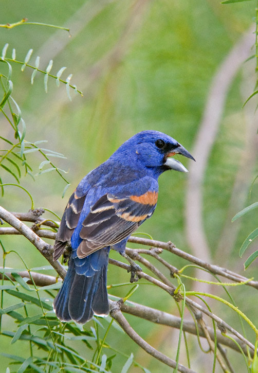 | The male Blue Grosbeak in the next six images was at Fort Niobrara N.W.R., Cherry Co., Nebraska, in July, 2011. These images were taken with a Canon EOS 1D Mark IV and an EF 500mm F/4 L IS lens and 1.4X extender. |