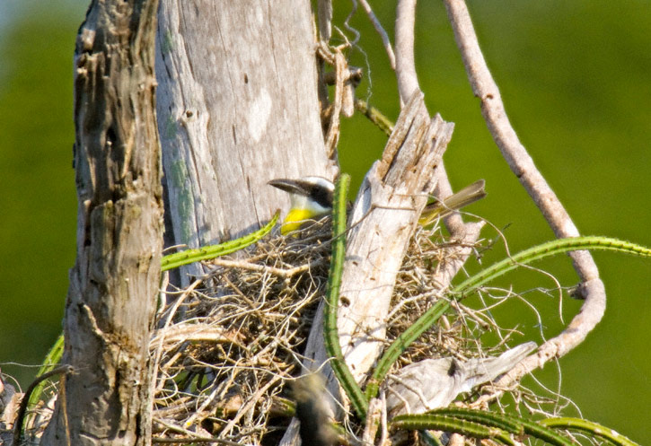 | The Boat-billed Flycatcher (Megarynchus pitangua) is a widespread tropical resident bird from northeastern Mexico southward to parts of Argentina. It is superficially similar in appearance to the Great Kiskadee but has an olive rather than a rufous back and a noticeably larger and longer bill. The Boat-billed Flycatcher in the top 5 shots shown here was at and near a nest in southern Tamaulipas, Mexico, in May, 2007. These shots were taken with a Canon EOS 1D Mark II and EF 500mm F/4 L IS lens and 2X extender. | ![]() |