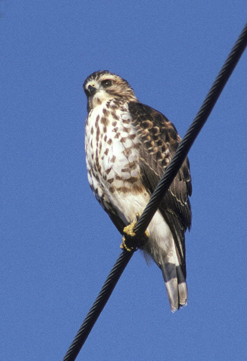 | The Broad-winged Hawk (Buteo platypterus) breeds across most of the eastern United States as well as a large area of Canada. This species, unlike most raptors, migrates in large flocks. There have been observations of as many as 100,000 birds tallied in a single day passing over some areas of south Texas during September. The species winters in South America. The juvenile Broad-winged Hawk in the photo at right was perched on a cable at Gulliver's Cove, Nova Scotia, Canada, in September, 1992. The shot was taken with a Canon T-90 and FD 400mm F/4.5 lens on Kodachrome 200 film. | ![]() |