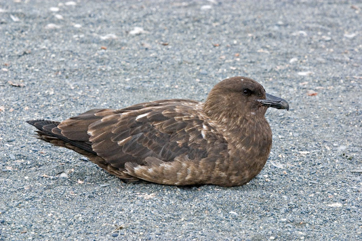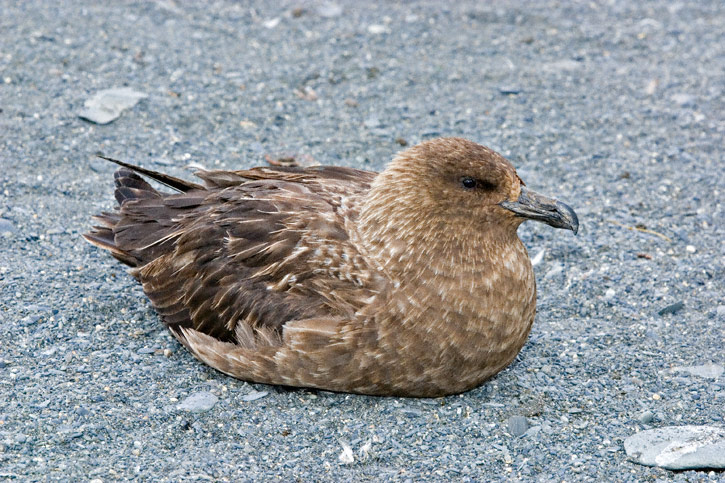| Illustrating some plumage differences are the two Brown Skuas shown in the next two shots resting on the dark gravel at Gold Harbor, South Georgia, in January, 2003. These digital images were taken with a Canon EOS D60 and EF 70-200mm F/2.8 L IS lens. |